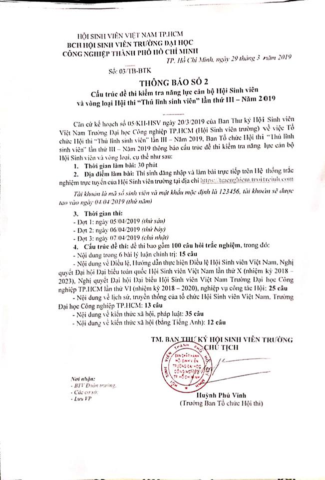 Thông báo số 02 - HSV - Thông báo về cấu trúc đề thi kiểm tra năng lực Cán bộ Hội sinh viên và vòng loại Hội thi "Thủ Lĩnh Sinh viên" lần III - năm 2019